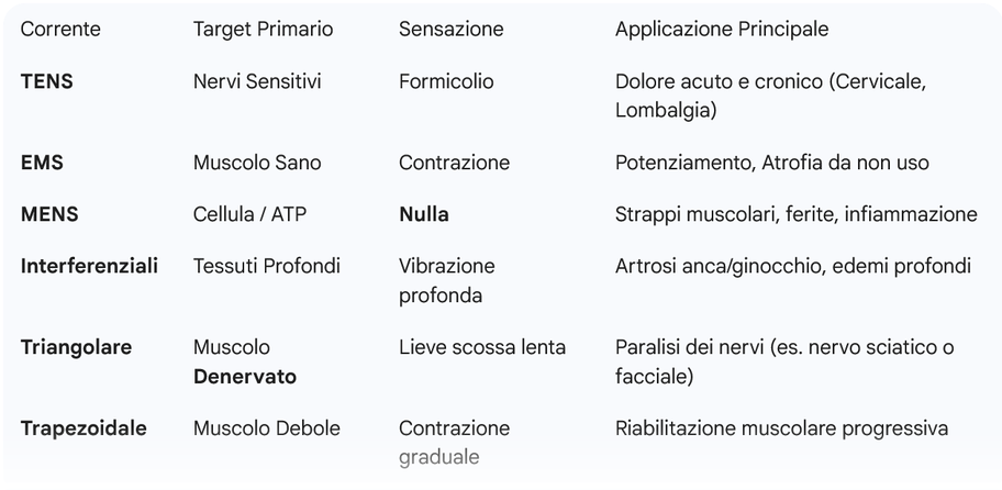 - MENS (Microcorrenti): Sono correnti "invisibili" (sotto la soglia di percezione). Aumentano l'energia cellulare (ATP) fino al 500%. Servono per riparare i tessuti lesionati, accelerare la cicatrizzazione e ridurre l'infiammazione profonda.